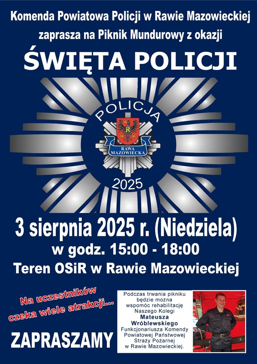 Policja Rawa Mazowiecka | Już 3 sierpnia 2025 roku w godzinach 15:00 – 18:00 na trenie Ośrodka Sportu i Rekreacji przy ulicy Tatar w Rawie Mazowieckiej odbędzie się „Piknik Mundurowy” z okazji Święta Policji. Organizatorem pikniku jest Komenda Powiatowa Policji w Rawie Mazowieckiej. Konie policyjne, płetwonurkowie i hydronetka zagwarantowana przez straż pożarną, malowanie twarzy, warkoczyki, […]